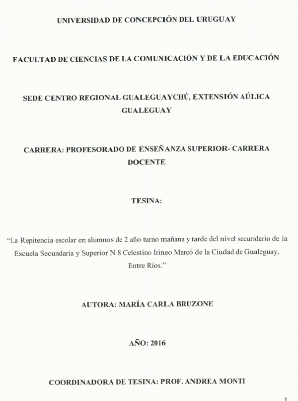La presente tesina se realiza en el marco de la carrera de Profesorado de Enseñanza Superior de la Facultad de Ciencias de la Comunicación y de la Educación de la Universidad de Concepción del Uruguay. La misma tiene como tema central la Repitencia Escolar. El objetivo principal es conocer las causas de la repitencia en estudiantes de 2ª año turno mañana y tarde de la Escuela Secundaria y Superior Nº 8 Celestino Irineo Marco, ubicada en calle Carmen Gadea Nº 20 de la ciudad de Gualeguay, provincia de Entre Ríos.