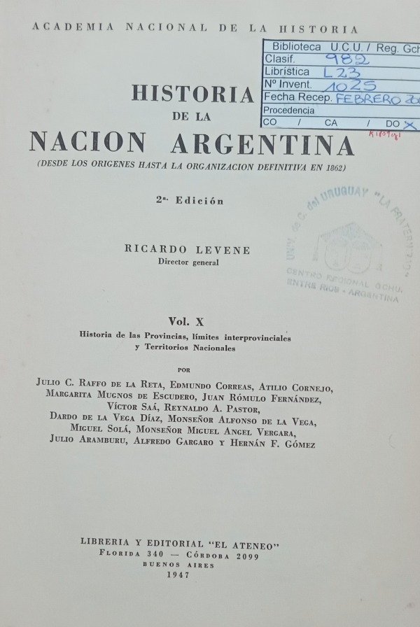 Historia de la Nación Argentina : desde los orígenes hasta la organización definitiva en 1862; v.10 Historia de las Provincias, límites interprovinciales y Territorios Nacionales / dirigida por Ricardo Levene.