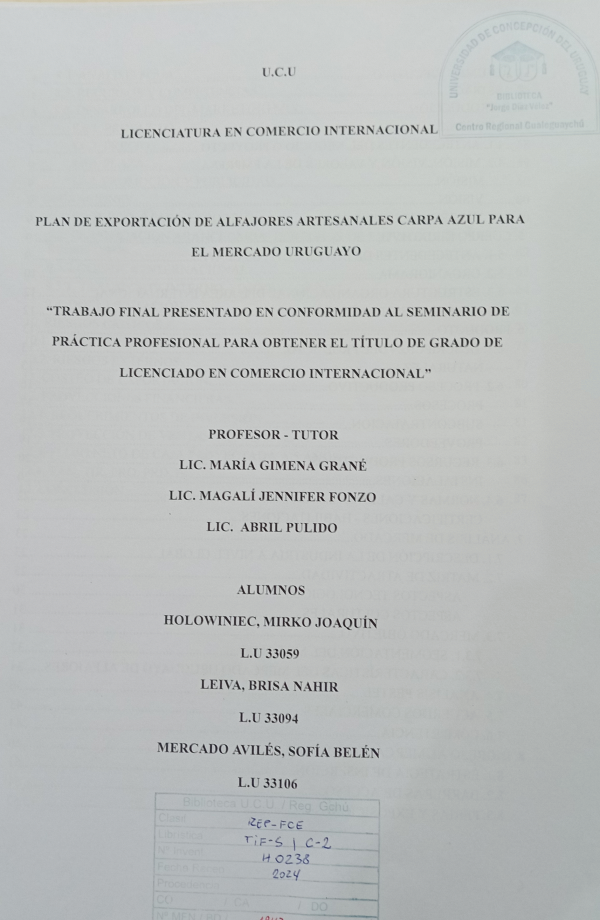 Plan de exportación de alfajores artesanales Carpa Azul para el mercado uruguayo / Mirko Joaquín Holowiniec, Nahir Brisa Leiva, Sofía Belén Mercado Avilés.