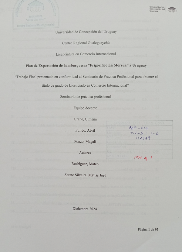 Plan de exportación de hamburguesas "Frigorífico La Morena" a Uruguay / Mateo Rodríguez, Matías Joel Zarate Silveira.