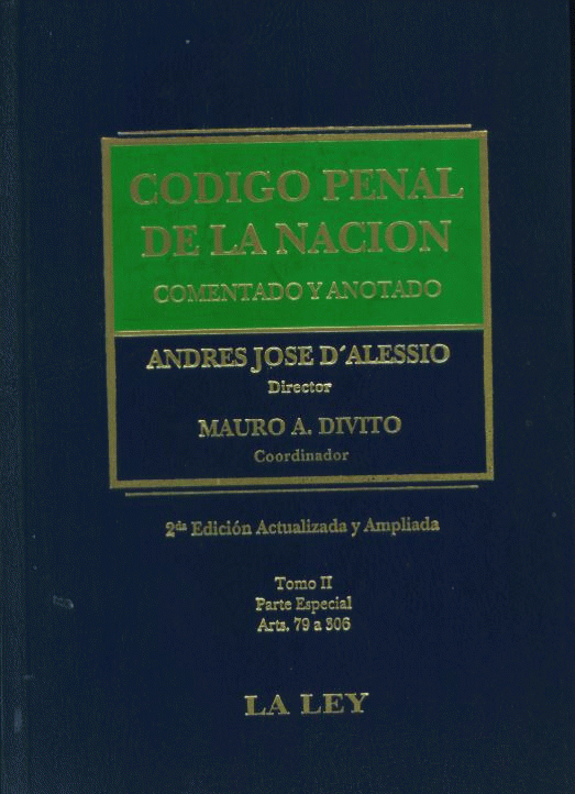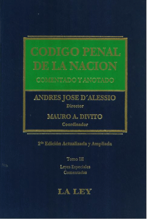 TextoIdioma: Español Detalles de publicación: Buenos Aires : La Ley, 2013.Edición: 2a ed. actualizada y ampliada 3a reimpresiónDescripción: 3 v. ; 25 cmTema(s): Resumen: T.1: Disposiciones generales. Aplicación de la ley penal. De las penas. Condenación condicional. Reparación de perjuicios. Imputabilidad. Tentativa. Participación criminal. Reincidencia. Concurso de delitos. Extinción de acciones y de penas. Del ejercicio de las acciones. De la suspensión del juicio a prueba. Significación de conceptos empleados en el código. T.2 De los delitos. Delitos contra las personas. Delitos contra el honor. Delitos contra la integridad sexual. Delitos contra el estado civil. Delitos contra la libertad. Delitos contra la propiedad. Delitos contra la seguridad publica. Delitos contra el orden publico. Delitos contra la seguridad de la Nación. Delitos contra los poderes públicos y el orden constitucional. Delitos contra la administración publica. Delitos contra la fe publica. T. 3 Propiedad intelectual. Profilaxis antivenérea. Incumplimiento de los deberes de asistencia familiar. Seguridad de la Nación. Ejercicio ilegal de la medicina veterinaria. Malos tratos y actos de crueldad a los animales. Prenda con registro. Código aeronáutico de la Nación. Identificación del potencial humano nacional. Régimen penal cambiario. Ejercicio ilegal de la profesión de geólogo. Código electoral nacional. Ejercicio ilegal de las profesiones de las ciencias económicas. Agio y abastecimiento. Régimen del registro nacional de reincidencia. Régimen penal de la minoridad. Marcas y designaciones. Código aduanero. Protección y conservación de la fauna silvestre. Espectáculos deportivos. Actos discriminatorios. Régimen penal de estupefacientes. Régimen de desechos peligrosos. Impedimento del contacto de los hijos menores con sus padres no convivientes. Ejecución de la pena privativa de la libertad. Régimen penal tributario. Ley de fomento del libro y la lectura. Protección del patrimonio arqueológico y paleontológico. Régimen legal para el desarmado de automotores y venta de sus autopartes. Migraciones. Servicios de comunicaciones móviles. Ley de implementación del estatuto de Roma de la Corte Penal Internacional.